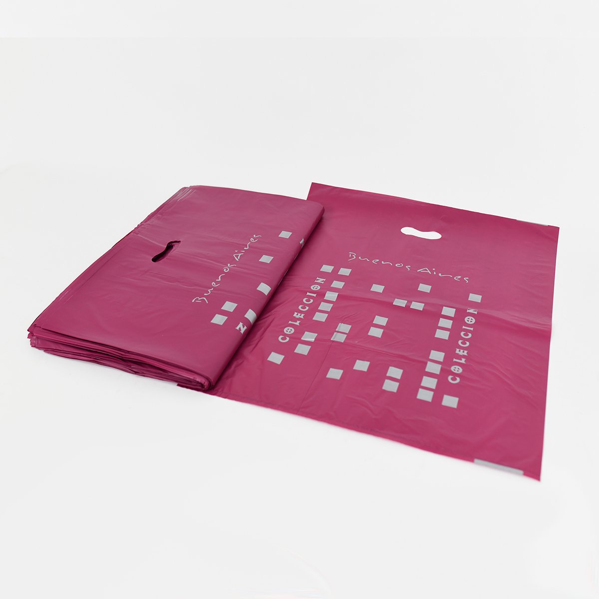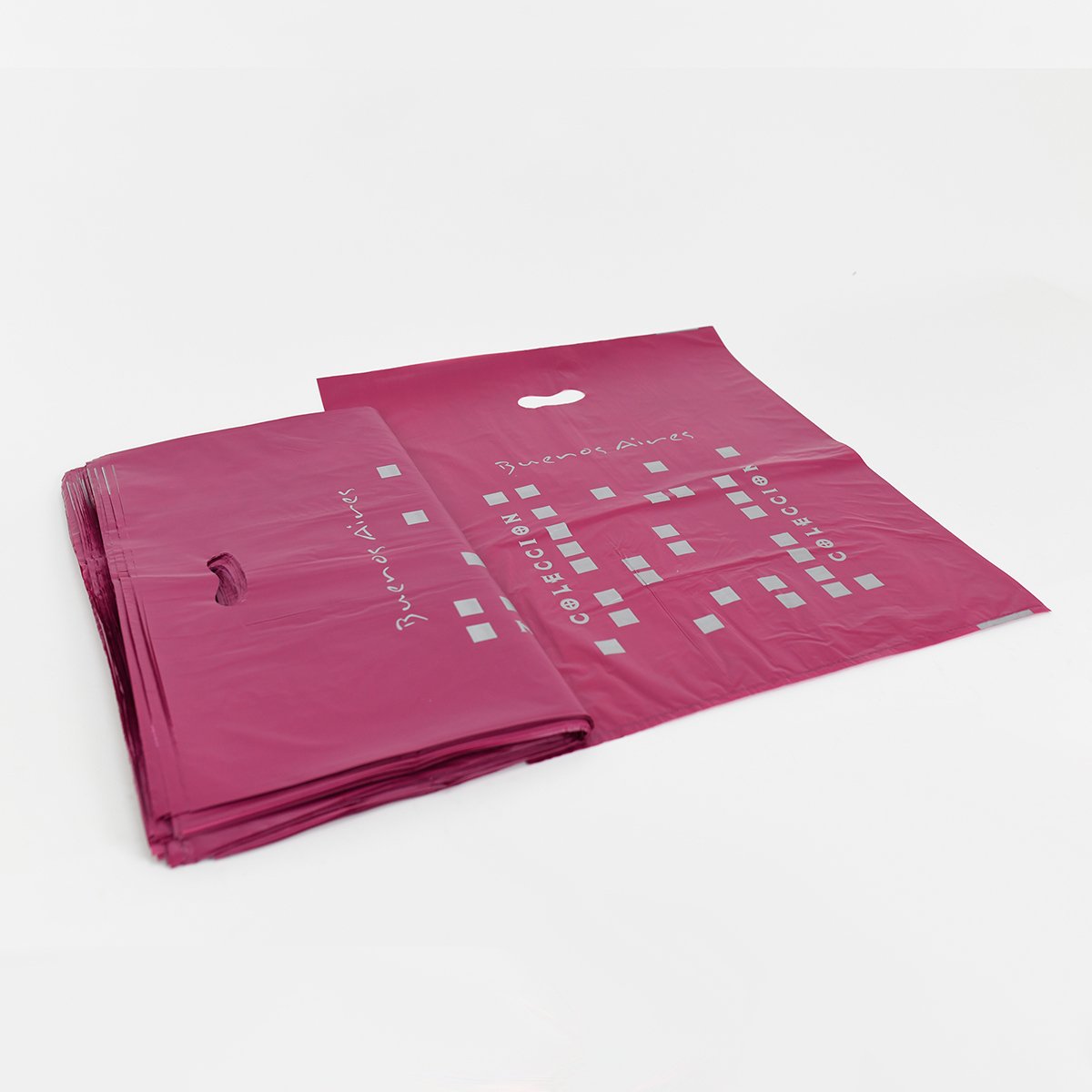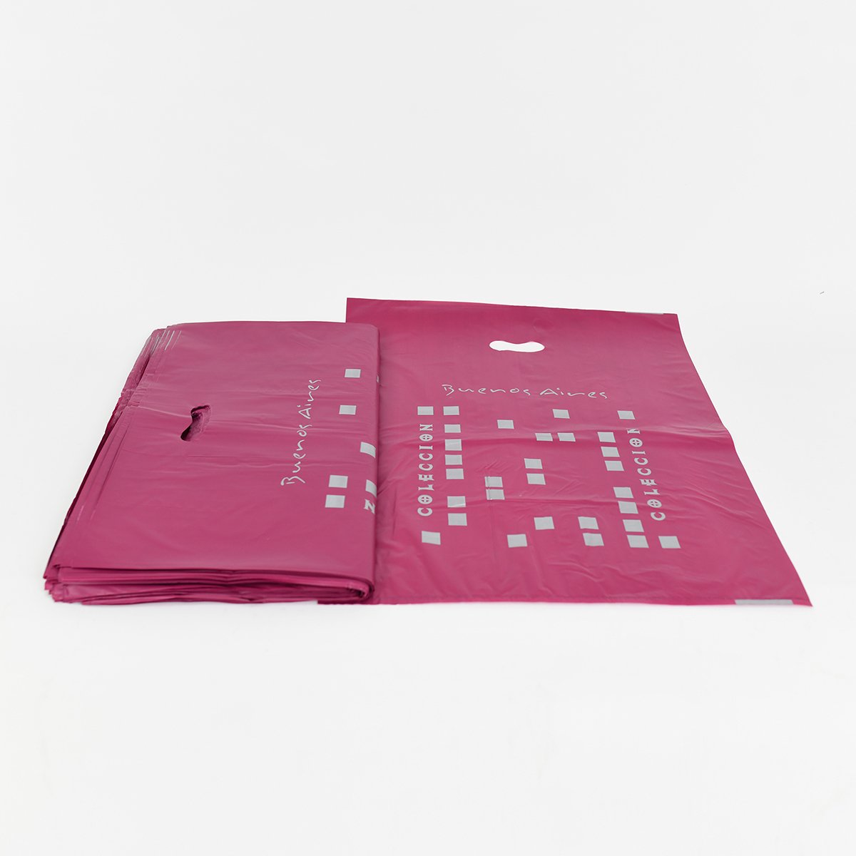 Bolsa de polietileno resistente de alta densidad y material virgen, ideal para entrega de productos, regalos o merchandising. Disponible en varios diseños y colores.