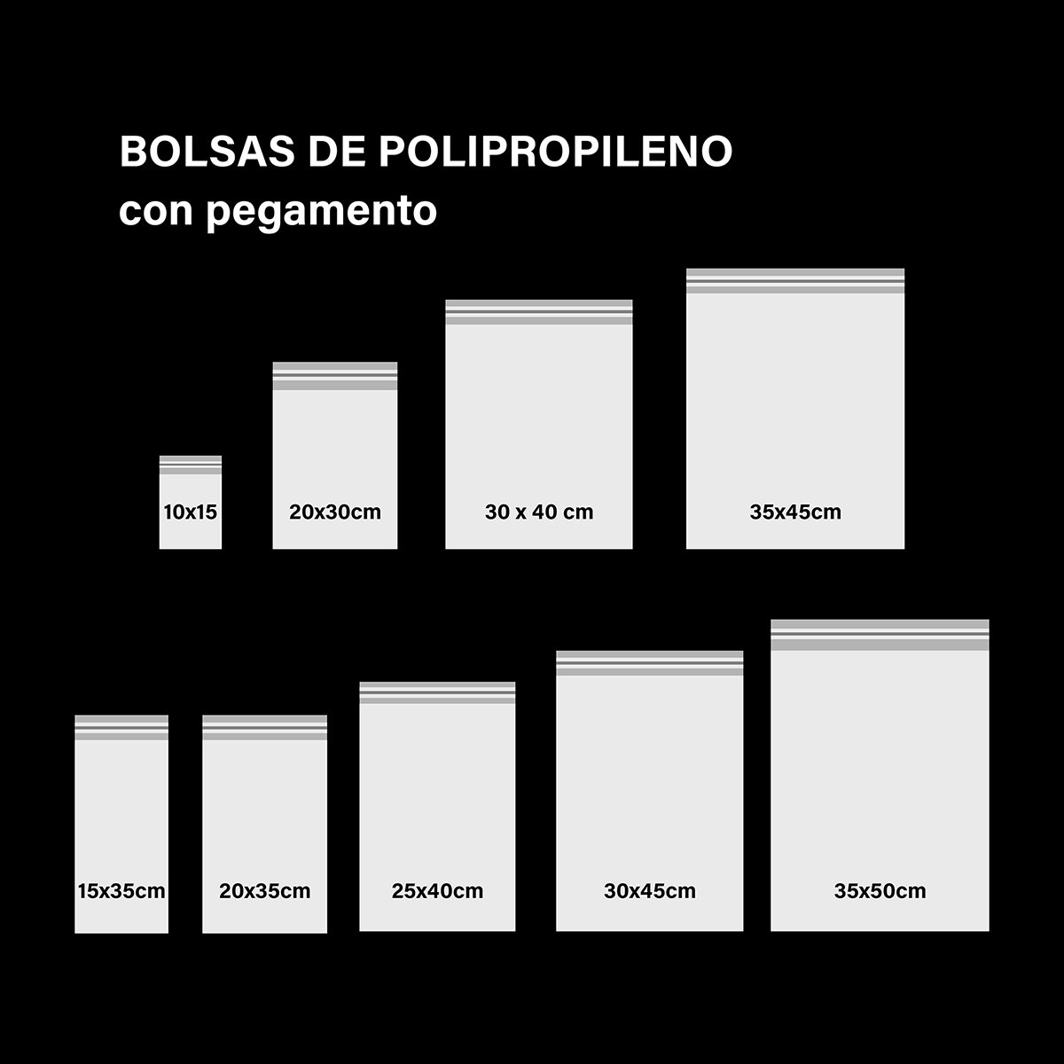 | Medida Bolsa de polipropileno c/ pegamento | 10×15+5, 15×20+5, 15×30+5, 20×30+5, 25×35+5, 30×40+5, 35×45+5 |